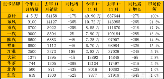 11月份的重卡市場(chǎng),用幾句老調(diào)重彈的話來(lái)說就是,毫無(wú)回暖跡象、繼續(xù)低迷徘徊、情況很不樂觀……這些話雖然沒什么新意,但卻是一語(yǔ)中的。