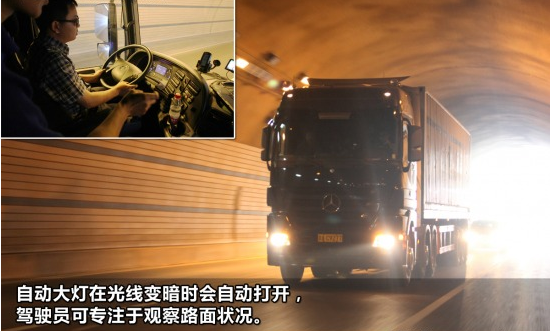 在此次試駕在北京西六環(huán)的時候經(jīng)過幾個短暫的隧道,當(dāng)Actros前風(fēng)擋玻璃后的光線傳感器探測到光線變暗之后自動將大燈打開,在黑暗的環(huán)境中,燈光會提醒對面車輛的駕駛員,避免出現(xiàn)交通事故。同時,駕駛員遇到隧道這樣光線突然變化的環(huán)境,就可以集中精力去觀察道路情況了,而不需要再去調(diào)節(jié)大燈。對于大燈的具體使用在歐洲都有明確的要求,國內(nèi)還沒有特別的法規(guī)要求。另外,光線傳感器同時實現(xiàn)了自動雨刷可以根據(jù)雨量大小自動控制雨刷速度的功能。此次試駕正好遇上大暴雨,在自動雨刷的輔助下,老??梢詫⒏嗑性谟^察路況,保證安全上。這些小的細節(jié)不僅更加方便,同時也提高了車輛的安全性。