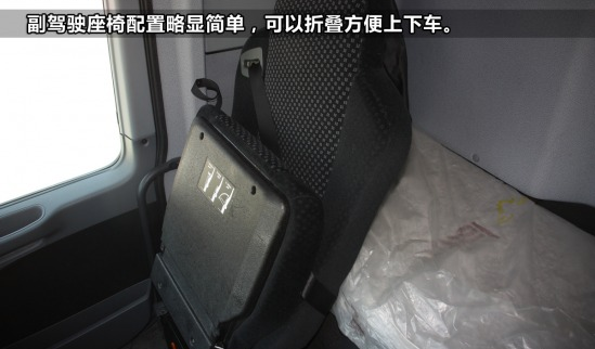 相比主駕駛座椅的豪華,副駕駛的配置則顯得比較簡單,座椅可以抬起,方便人員上下。這也與歐洲卡車的使用情況有關(guān),歐洲卡車很多都是只有一個駕駛員,副駕駛使用的情況并不是很多。