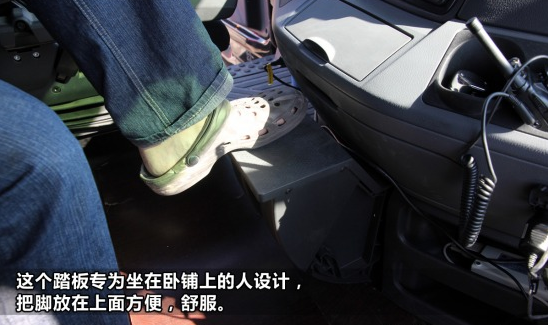 除了駕駛員和副駕駛,另外兩個人就需要坐在臥鋪上了。試駕過程中還要測試各種減速制動的項目,中控臺前一篇空曠還是有點危險的。不過奔馳的設(shè)計師似乎很早就幫我們想到了這點,在中控臺下面可以彈出一個腳踏板,坐在臥鋪上可以將腳放在那上面有個支撐,不用的時候可以收起來。