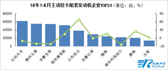 輕卡配套動力方面,從2016年1-8月份配套信息來看,配套前三的發(fā)動機(jī)企業(yè)分別是江鈴汽車、柳州五菱和安徽全柴,配套量分別為6.19萬臺、5.55萬臺和5.46萬臺,同比降幅分別為-9.3%、-19.8%和-20.1%。輕卡配套前十的發(fā)動機(jī)企業(yè)中,云內(nèi)動力同比增長61.9%,增幅最大;福田環(huán)保動力同比下降23.2%,降幅最大。