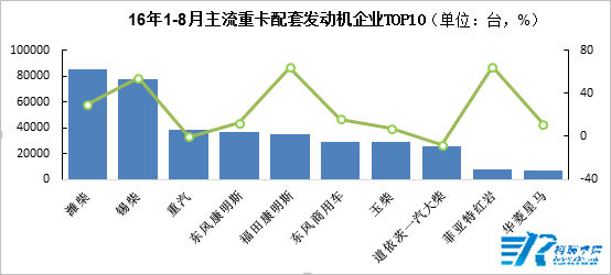 重卡配套動(dòng)力方面,從2016年1-8月份配套信息來看,配套前三的發(fā)動(dòng)機(jī)企業(yè)分別是濰柴、錫柴和重汽,累計(jì)配套量分別為8.51萬輛、7.75萬輛和3.85萬輛,同比增幅分別為30.1%、54.5%和-0.3%。重卡配套前十的發(fā)動(dòng)機(jī)企業(yè)中,福田康明斯和菲亞特紅巖同比增幅均超過60%,增幅較大;道依茨一汽大柴同比下降7.7%,降幅最大。